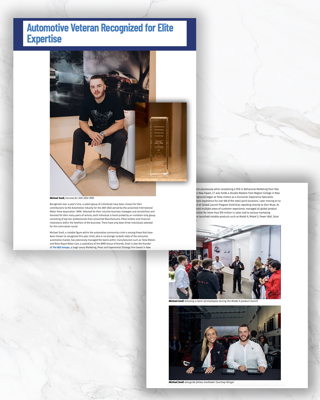 Michael obtained a Bachelor’s Degree in Marketing & Management from Wagner College in New York City. While in college, he worked at the prestigious Bloomingdale’s Flagship location under the Macy’s Corporation where he reconceptualized and directed the Customer Retention and Engagement Training Program at the in New York City. Training over 2600+ employees, he successfully proved a yield of 23% higher sales production over 8 months, and tracked a 15% transition of retained seasonal employees to full-time positions based on performance. He then transitioned to a new chapter and was able to complete his first Master’s Degree in Marketing while working as a Consumer Experience Specialist at Tesla Motors, designing the start to end experience in-store/in-person for consumers. Fulfilling that short term team role, was given the opportunity to transition to the Executive Management Team reporting directly to Elon Musk, becoming the Global Launch Programs Director. There, he re-designed multiple areas of customer experience, managed global product launches and was responsible for $170 million in sales tied to various marketing campaigns. In addition, he launched notable products such as: Model X, Model 3, Power Wall, Solar Roof and the Gigafactory. Subsequently, during his term at Tesla, he completed his second Master’s Degree in Management. Michael was brought on to the BMW Group and lead at the Marketing team for Rolls-Royce Motor Cars North America. Overseeing the North and South America and Canada, he directed product launches, digital campaigns, and dealer relations. He also developed a newly defined business visibility strategy that pushed the iconic, heritage-centric company into the eyes and minds of younger, educated consumers. While his budgeting revisions proved positive with company savings in the million(s), the launches of both iconic models which included Phantom VIII and World’s most luxurious (and most expensive) SUV, Cullinan took this side of the world by storm. He has been responsible for the largest revenue-generating market tied to marketing initiatives since, so current sources report, and an unmatched and unparalleled experience at Rolls-Royce North America for both owners and potential clients.
